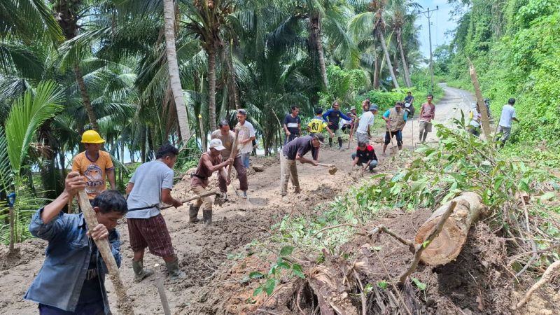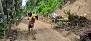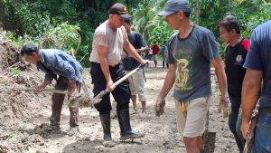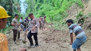 Untuk mengatasi hal tersebut, Kapolsek Balantak AKP Teddy Polii bersama anggota dan sejumlah masyarakat berjibaku membersihkan material longsor.